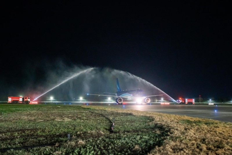 Mlli aviadaşıyıcının təyyarəsi ənənəvi olaraq su tağı ilə qarşılanıb.