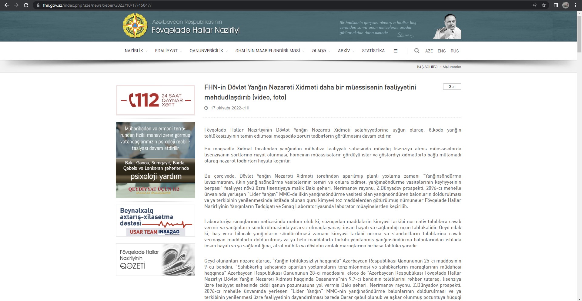 "Azərbaycan Respublikasının Fövqəladə Hallar Nazirliyinin “Youtube” kanalında və onlayn media subyektlərində Cəmiyyətimiz barədə heç bir hüquqi əsası olmayan məlumatlar yayılmışdır. Əsası olmayan, həqiqətə uyğun olmayan məlumatlar təkzib olunmalı, düzəliş verilməli və ya üzr istənilməlidir. Əks təqdirdə müvafiq xəbəri yaymış və onun yaylmasında iştirak etmiş media subyektləri barədə qanunvericiliyin tələblərinə uyğun olaraq məhkəməyə müraciət ediləcəkdir",- “Lider Yanğın” MMC-nin media subyektlərinə müraciətində bildirilir.