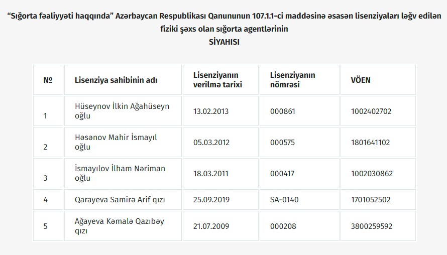 Azərbaycan Respublikası Mərkəzi Bankının İdarə Heyətinin 23 noyabr 2022-ci il tarixli qərarı ilə siyahıda göstərilən (siyahı əlavə olunur) 5 nəfər fiziki şəxsə sığorta agenti fəaliyyətinə verilmiş lisenziyalar ləğv edilmişdir.