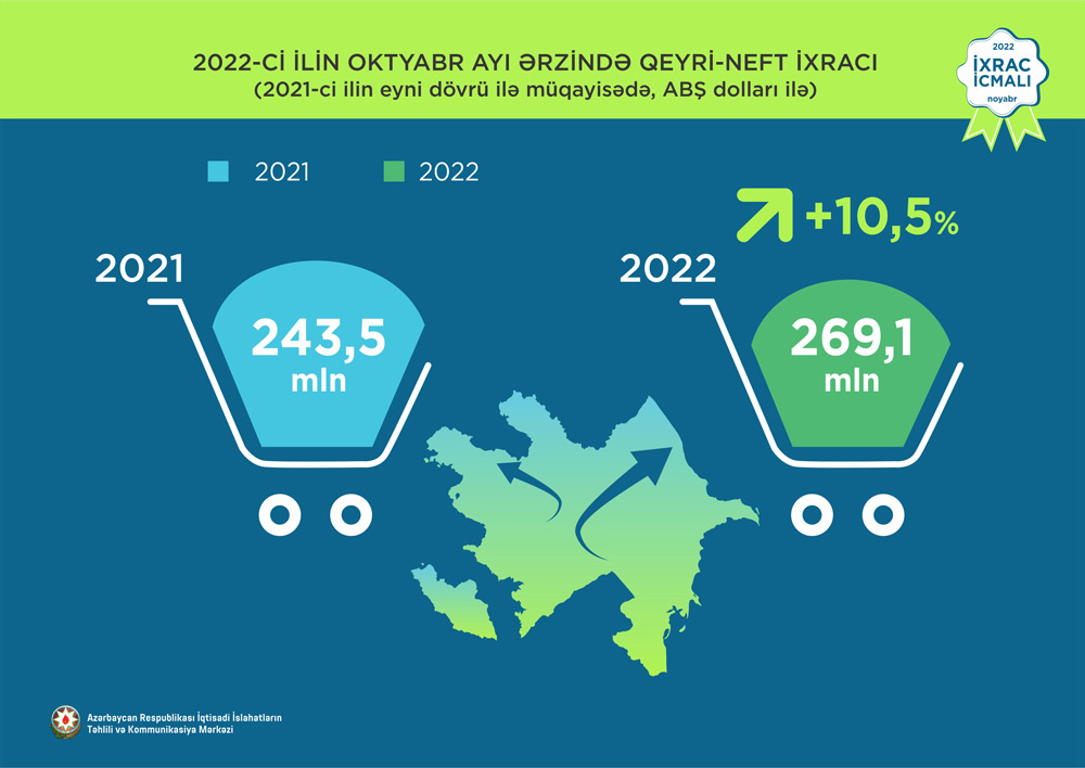2022-ci ilin oktyabr ayı üzrə ixrac 5,2 milyard ABŞ dolları, qeyri-neft sektoru üzrə ixrac isə 269,1 milyon ABŞ dolları təşkil edib. 2022-ci ilin oktyabr ayı ərzində yeyinti məhsulları üzrə ixrac 73 milyon ABŞ dolları, qeyri-yeyinti məhsulları üzrə isə 17,5% artaraq 196,2 milyon ABŞ dollarına bərabər olub.
