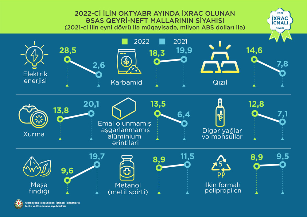 2022-ci ilin yanvar-oktyabr ayları ərzində ixrac edilən qeyri-neft sektoruna aid malların siyahısında karbamid (181,8 milyon ABŞ dolları) birinci olub. Bu siyahıda pambıq mahlıcı (151,9 milyon ABŞ dolları) ikinci, qızıl (143 milyon ABŞ dolları) isə üçüncü yerdə qərarlaşıb.