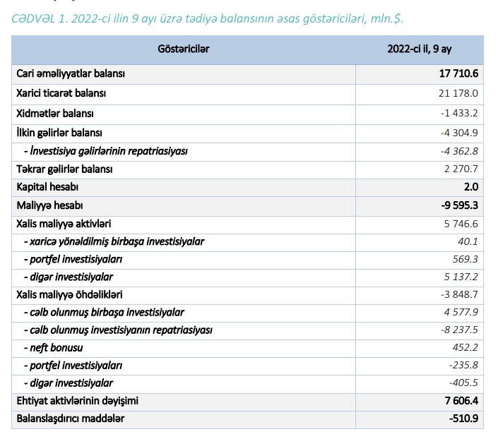 "2022-ci ilin 9 ayı üzrə tədiyə balansı əsasən qlobal əmtəə bazarlarında neft-qaz qiymətlərinin və qeyri-neft-qaz ixracının əhəmiyyətli artımından təsirlənmişdir. Cari əməliyyatlar balansında 17.7 milyard dollar profisit, kapital və maliyyənin hərəkəti hesabında isə 9.6 milyard dollar kəsir yaranmış, ehtiyat aktivləri 7.6 milyard dollar artmışdır. Bu dövrdə xam neftin orta qiyməti 107 dollar/barel olmuş, qeyri-neft-qaz ixracı isə 21.5% artaraq 2 milyard dollar səviyyəsində formalaşmışdır",- Hesabatda deyilir.