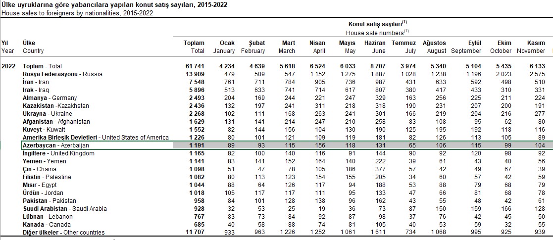 2022-ci ilin yanvar-noyabr aylarında (11 ayda) azərbaycanlılar Türkiyədə 1191 mənzil (ev) alıblar.