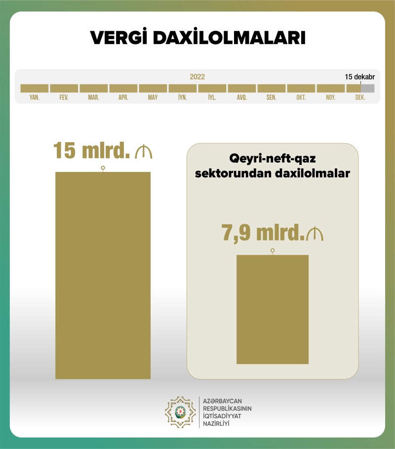 15 dekabr tarixinə olan məlumata görə, dövlət büdcəsinə vergi daxilolmalarının həcmi ilk dəfə olaraq 15 milyard manatı keçib.