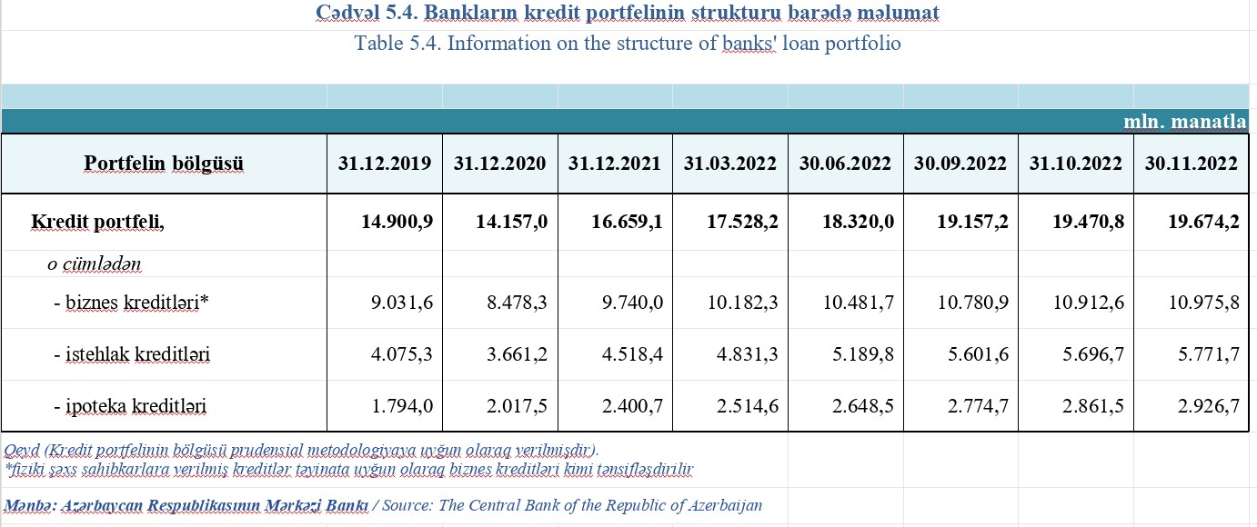2022-ci ilin 11 ayı ərzində 3 milyard 15,1 milyon manat, o cümlədən biznes kreditləri 1 milyard 235,8 milyon manat, istehlak kreditləri 1 milyard 253,3 milyon manat, ipoteka kreditləri 526 milyon manat artıb.