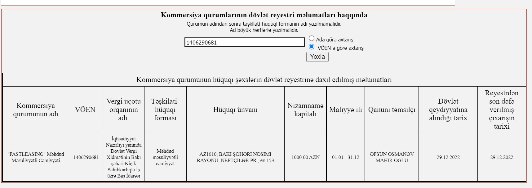 29 Dekabr 2022-ci il tarixində Dövlət Vergi Xidməti "Fast Leasing" MMC-ni dövlət qeydiyyatına alıb.