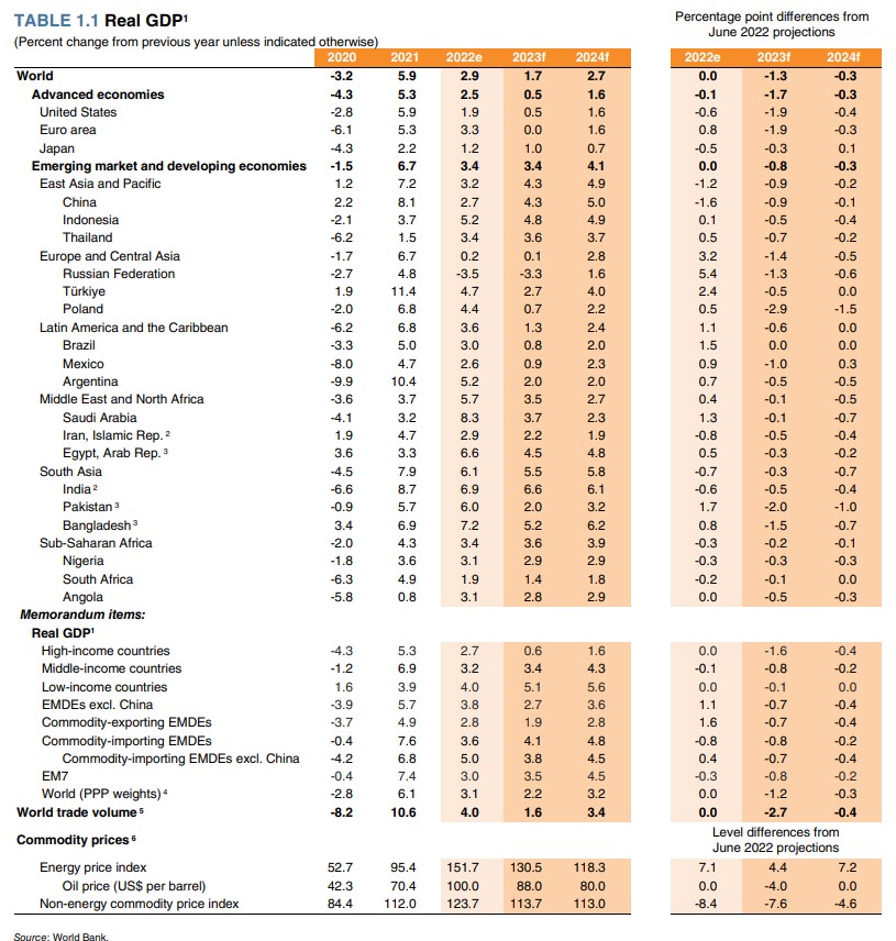 Dünya Bankı hesab edir ki, qlobal iqtisadi artımın yavaşlaması onun resessiyaya yaxınlaşdığını göstərir. Adambaşına düşən illik qlobal gəlirin azalmasına yüksək inflyasiya, eləcə də bəzi ölkələrdə monetar sərtləşdirmə səbəb olub. İqtisadi inkişaf baxımından üç əsas dünya lideri – ABŞ, Avropa və Çin iqtisadi göstəricilərin kəskin azalması ilə üzləşib və bu, inkişaf etməkdə olan ölkələrin bazarında pisləşməyə səbəb olub.