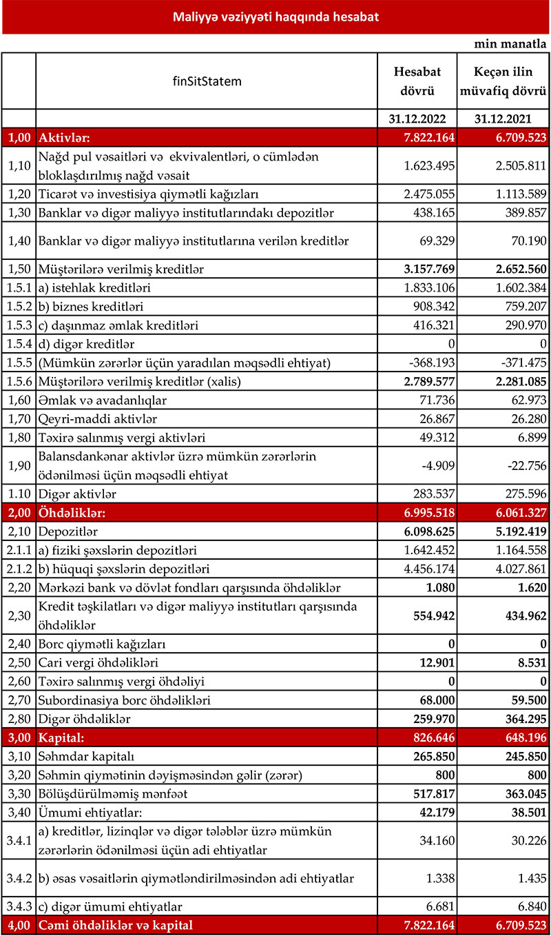Xatırladaq ki, 30 sentyabr 2022-ci il tarixində "Kapital Bank"ın cəmi kredit portfeli 3 milyard 234 milyon 143 min manata, o cümlədən istehlak kreditləri portfeli 1 milyard 866 milyon 657 min manata, biznes kreditləri portfeli 992 milyon120 min manata, ipoteka kreditləri porrtfeli isə 375 milyon 366 min manata çatmışdı.