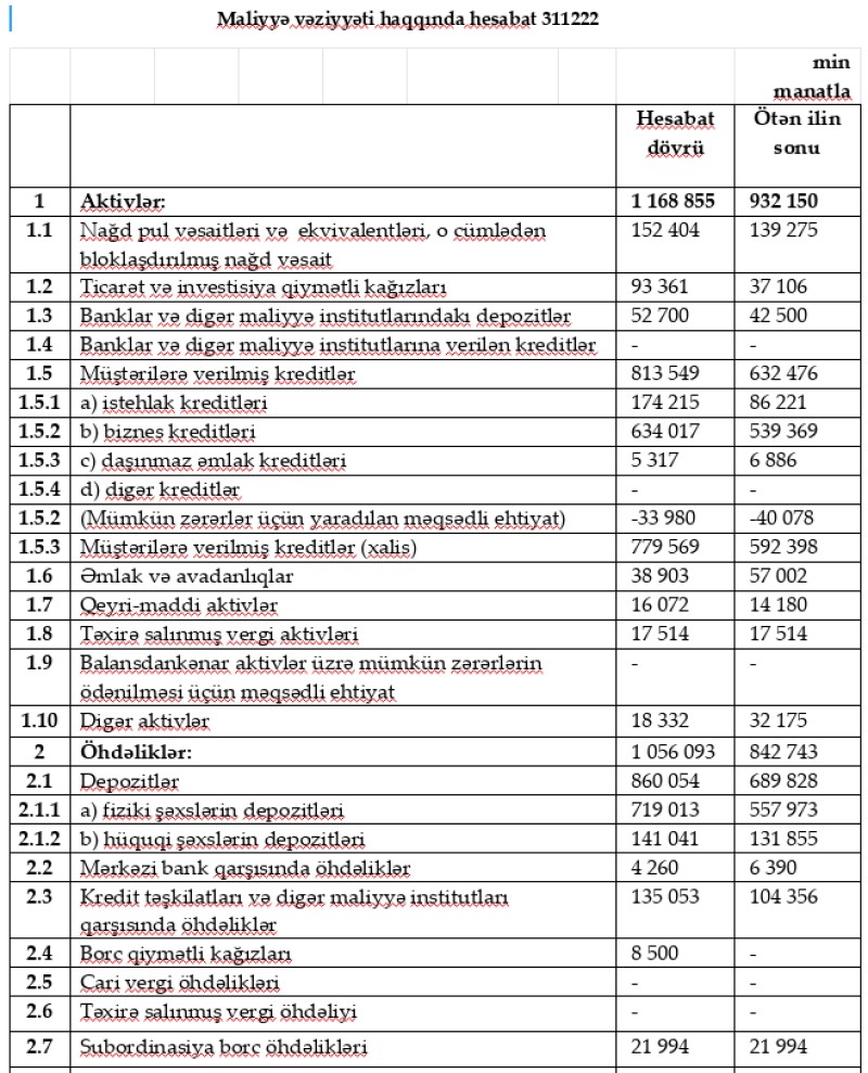-Bankın 2022-ci il üzrə yekun xalis mənfəəti də 2021-ci ilin nəticəsi ilə müqayisədə dəfələrlə artaraq 15 milyon manata çatıb. 4-cü rüb ərzində bankın xalis mənfəəti cari ilin 3-ci rübü ilə müqayisədə 3 dəfəyə qədər artıb.