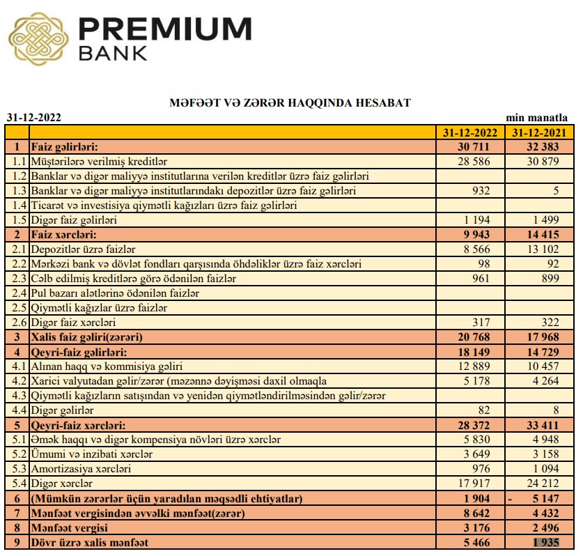 Marja.az xəbər verir ki, "Premium Bank" ASC 2022-ci ili 5 milyon 466 min manat xalis mənfəət ilə başa vurub. Bank 2021-ci ili 1 milyon 935 min manat xalis mənfəət ilə bağlamışdı. Beləliklə, "Premium Bank"ın xalis mənfəəti 2,8 dəfə artıb. Xalis mənfəətin artması gəlirlərin artmasından və xərclərin azaldılmasından qaynaqlanır.