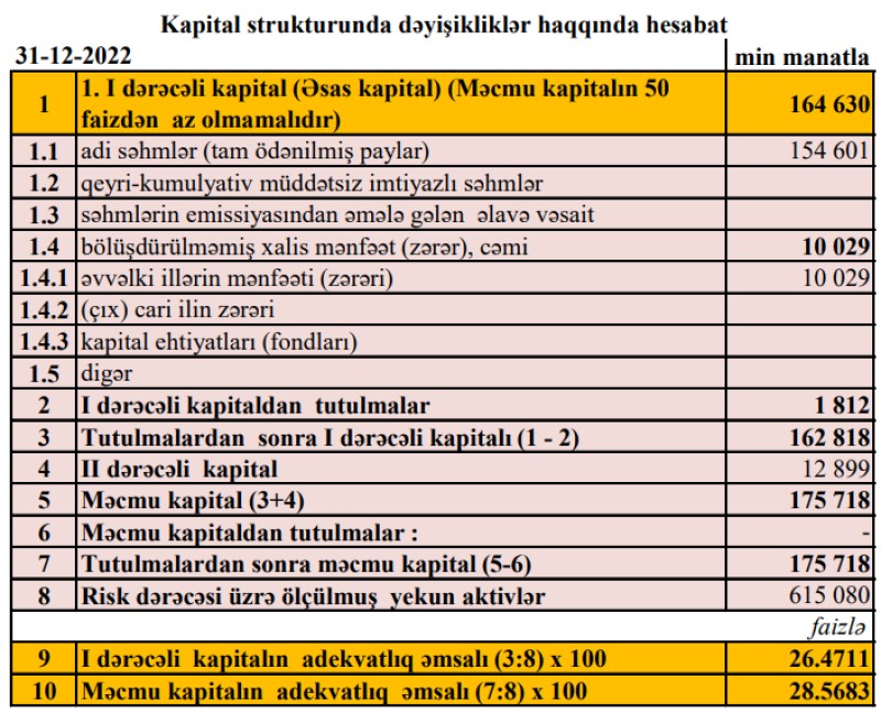 Müqayisə üçün qeyd edək ki, 2021-ci ildə Bankın əməliyyat gəlirləri (faiz və qeyri-faiz gəlirləri) 47 milyon 112 min manat, əməliyyat xərcləri (faiz və qeyri-faiz xərcləri) 47 milyon 826 min manat, xərclər gəlirləri üstələdiyindən əməliyyat zərəri 714 min manat təşkil etmişdi.
