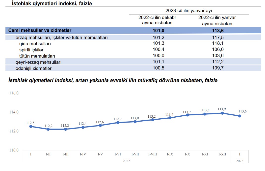 2023-cü ilin yanvar ayında istehlak qiymətləri indeksi (inflyasiya göstəricisi) 2022-ci ilin yanvar ayına nisbətən 13,6 faiz, o cümlədən ərzaq məhsulları, içkilər və tütün məmulatları üzrə 17,5 faiz, qeyri-ərzaq məhsulları üzrə 12,2 faiz, əhaliyə göstərilmiş ödənişli xidmətlər üzrə 9,7 faiz artıb.