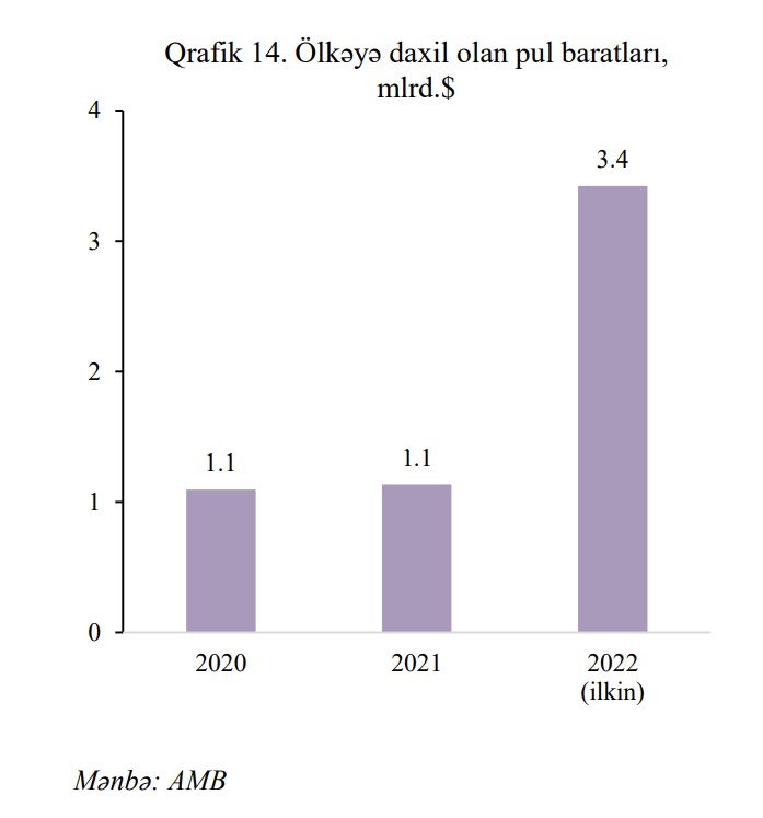 İlkin rəqəmlərə əsasən 2022-ci il ərzində Azərbaycana daxil olan pul baratları 2021-ci illə müqayisədə 3 dəfə artaraq 3,4 milyard ABŞ dolları olmuşdur.