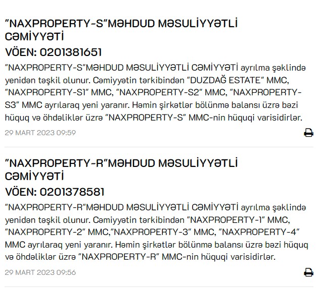 Qeyd edilib ki, Cəmiyyətin tərkibindən "DUZDAĞ ESTATE" MMC, "NAXPROPERTY-S1" MMC, "NAXPROPERTY-S2" MMC, "NAXPROPERTY-S3" MMC ayrılaraq yeni yaranır. Həmin şirkətlər bölünmə balansı üzrə bəzi hüquq və öhdəliklər üzrə "NAXPROPERTY-S" MMC-nin hüquqi varisidirlər.