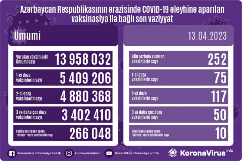 Azərbaycanda son sutkada koronavirus (COVID-19) əleyhinə 252 vaksin vurulub. Bir gündə birinci mərhələ üzrə vaksinasiya olunanların sayı 75, ikinci mərhələ üzrə vaksinasiya olunanların sayı 117, üç və daha çox doza üzrə vaksinasiya olunanların sayı 50, pozitiv nəticədən sonra buster doza üzrə vaksinasiya olunanların sayı 10 nəfərdir.