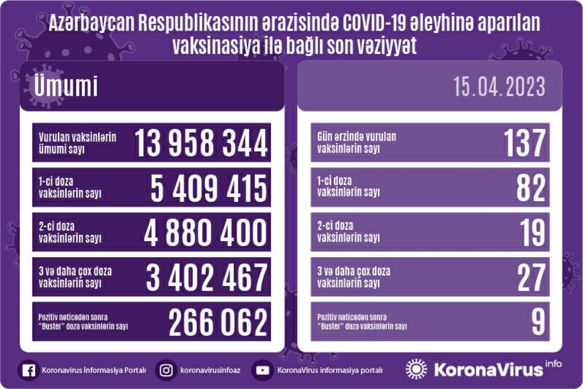 Azərbaycanda son sutkada koronavirus (COVID-19) əleyhinə 137 vaksin vurulub. Bir gündə birinci mərhələ üzrə vaksinasiya olunanların sayı 82, ikinci mərhələ üzrə vaksinasiya olunanların sayı 19, üç və daha çox doza vaksin vurduranların sayı 27, pozitiv nəticədən sonra buster doza üzrə vaksinasiya olunanların sayı isə 9 nəfərdir.