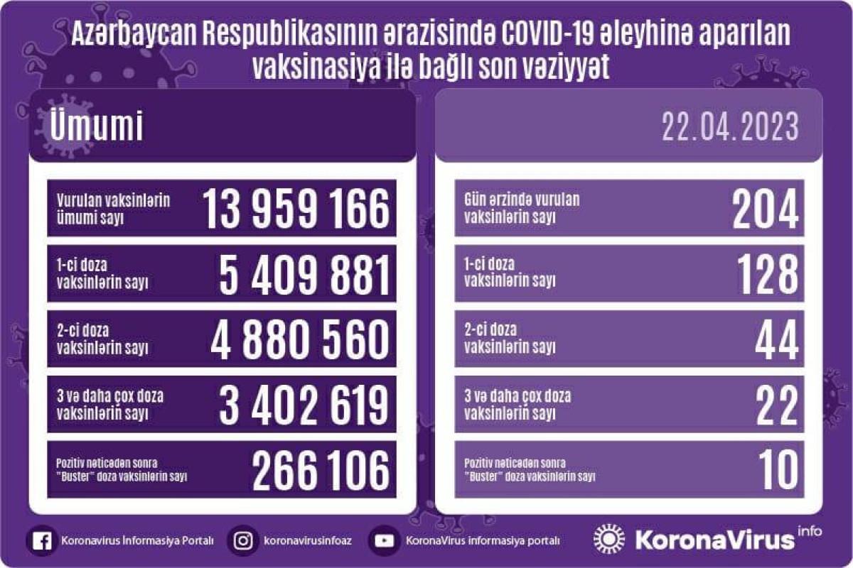 Bir gündə birinci mərhələ üzrə vaksinasiya olunanların sayı 128, ikinci mərhələ üzrə vaksinasiya olunanların sayı 44, üç və daha çox doza üzrə vaksinasiya olunanların sayı 22, pozitiv nəticədən sonra buster doza vaksinasiya olunanların sayı 10 olub.