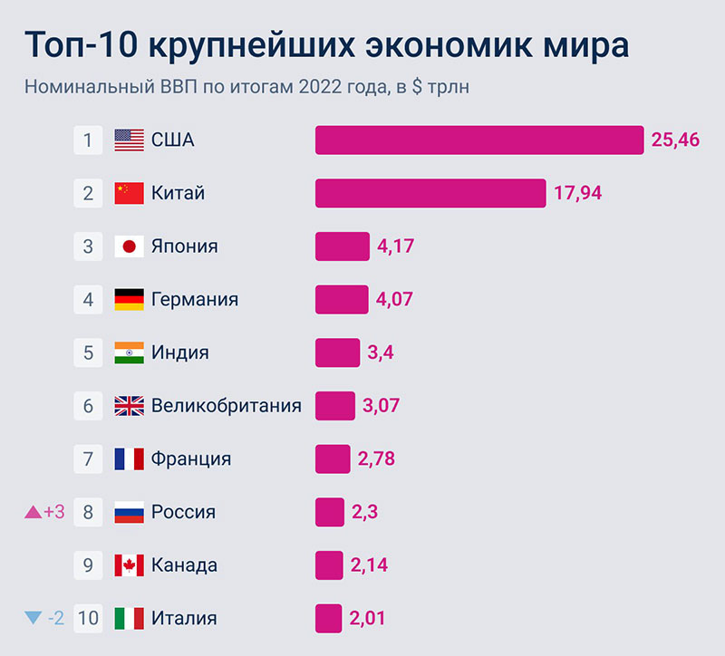2022-ci ildə dünyanın ən böyük iqtisadiyyatı 25,46 trilyon dollar nominal ÜDM ilə ABŞ olaraq qalıb. Çin ikinci yerdədir (17,94 trilyon dollar), üçüncü lider isə ənənəvi olaraq Yaponiyadır (4,17 trilyon dollar).