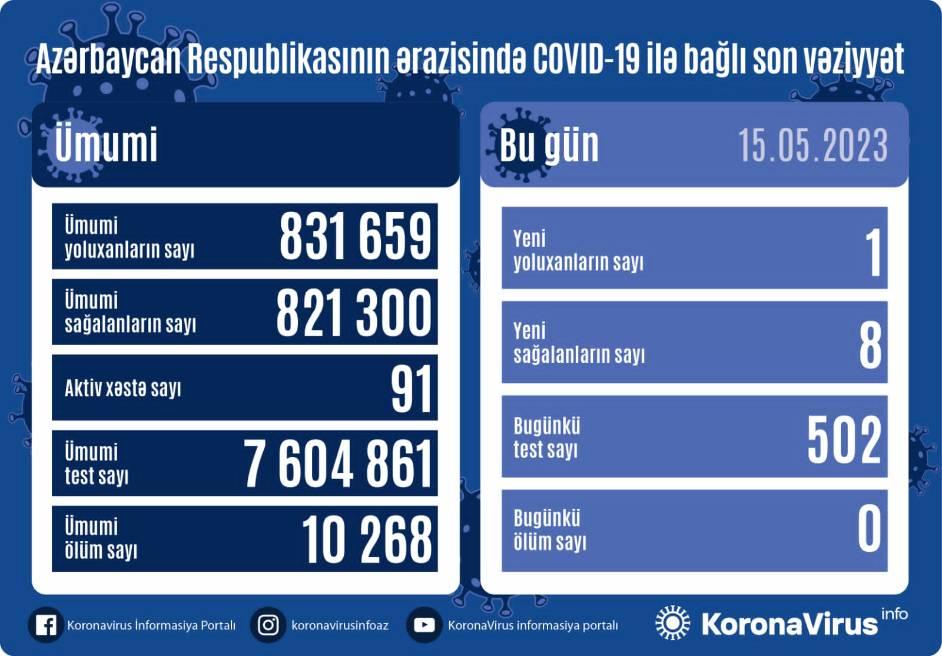 Məlumata görə, son sutka ərzində yeni yoluxma hallarının müəyyənləşdirilməsi ilə əlaqədar 502, bu günə qədər isə ümumilikdə 7 604 861 test icra olunub.
