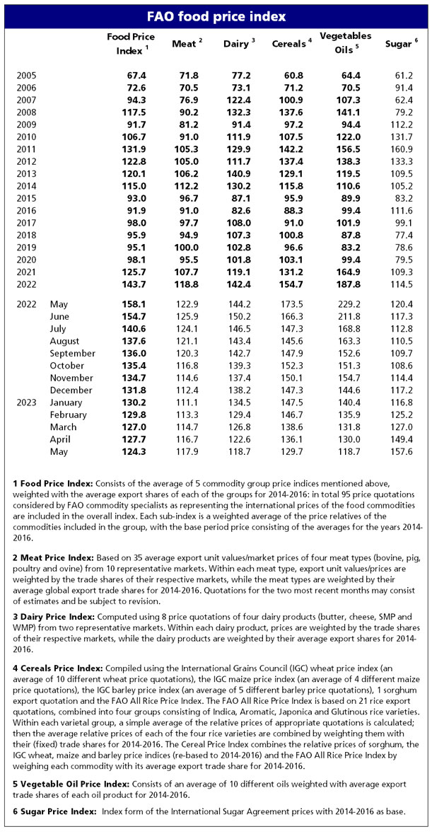 Marja xəbər verir ki, FAO-nun Ərzaq Qiymətləri İndeksi may ayında aylıq müqayisədə 2,6%, illik müqayisədə isə 22,1 faiz azalaraq orta hesabla 124,3 bənd olub.