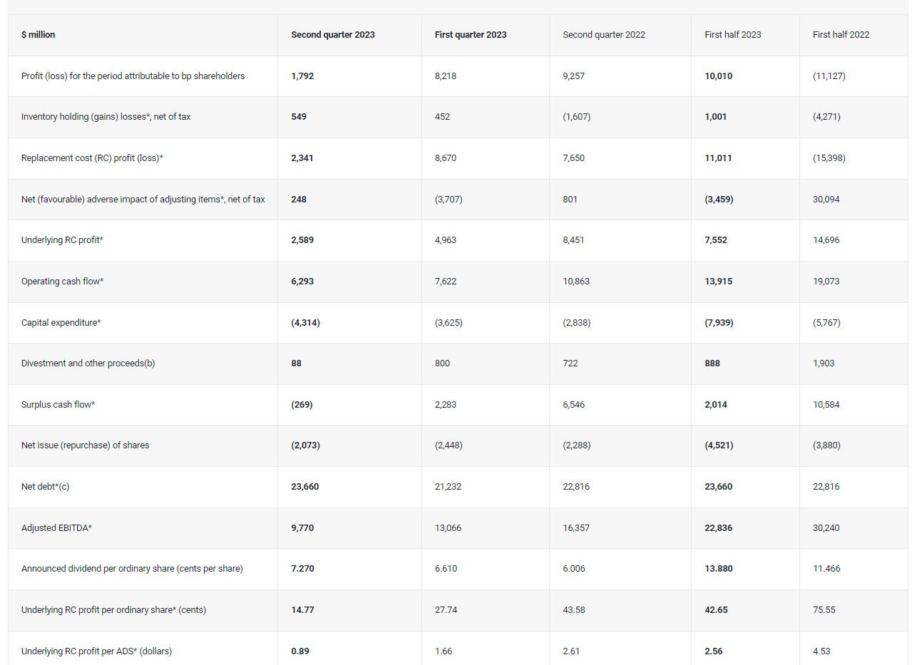 Böyük Britaniyanın neft və qaz nəhəngi BP Plc.-nin səhmdarlarına aid olan xalis mənfəəti bu ilin birinci yarısında 10,01 milyard dollar təşkil edib.Şirkət ötən ilin eyni dövründə 11,127 milyard dollar zərər etmişdi. BP-nin bu ilin ikinci rübdə xalis mənfəəti 5,2 dəfə azalaraq 1,792 milyard dollar olub.Böyük Britaniyanın neft-qaz şirkəti BP-nin 2023-cü ilin ikinci rübündə şirkətin səhmdarlarına məxsus xalis mənfəəti ötən ilin eyni dövrü ilə müqayisədə 5,2 dəfə azalaraq 1,8 milyard dollar təşkil edib. Şirkət ötən ilin 2-ci rübündə 9,3 milyard dollar xalis mənfəət əldə etmişdi.