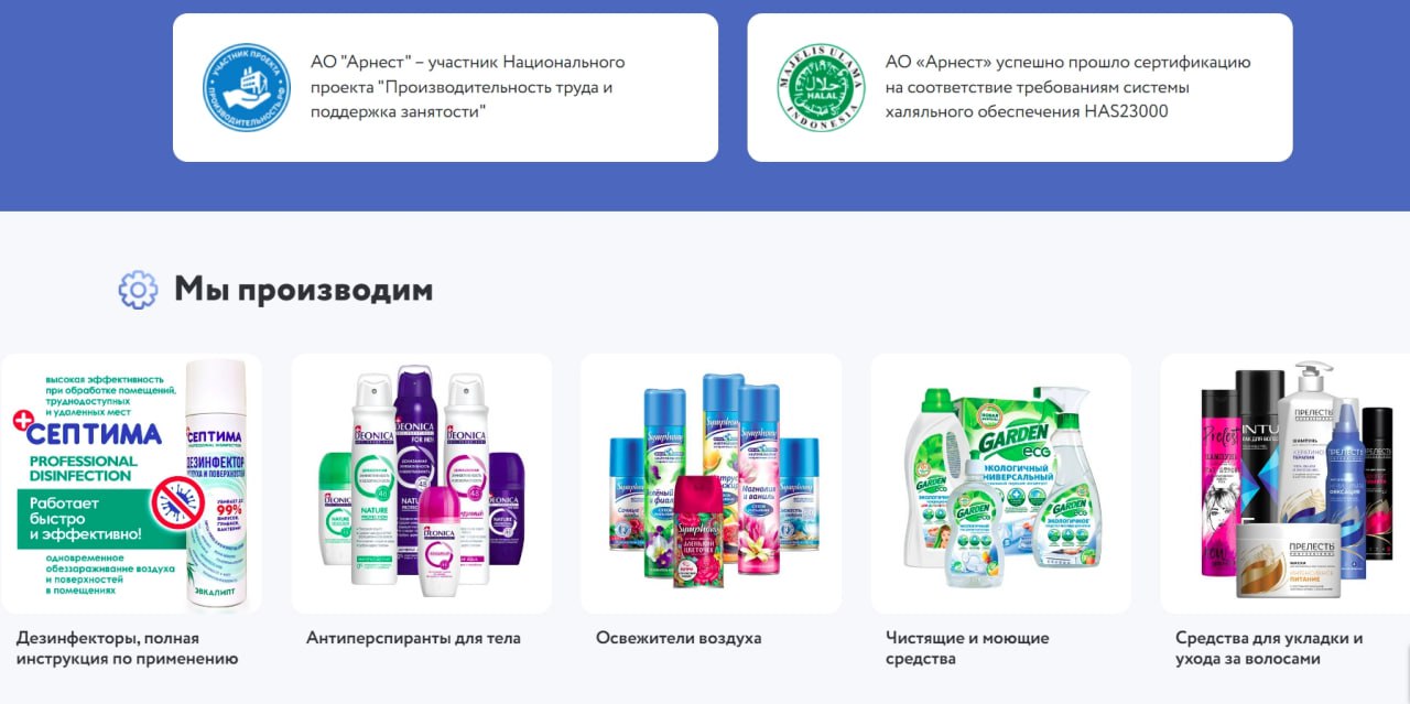 "Arnest Group", Stavropol diyarının Nevinnomyssk şəhərində qeydiyyata alınmışdır, şirkət 600-dən çox məhsul istehsal edir. Qrupa şəhərdəki məişət kimyası zavodu, həmçinin 1970-ci ildən bəri saç lakının istehsal olunduğu Aerosol Novomoskovsk müəssisəsi daxildir. "Arnest Group"un 2 min işçisi var. Şirkət Sentyabr ayında dünyanın ən böyük alüminium qablaşdırma istehsalçısı olan Ball Corporation-ın aktivlərini satın alıb.
