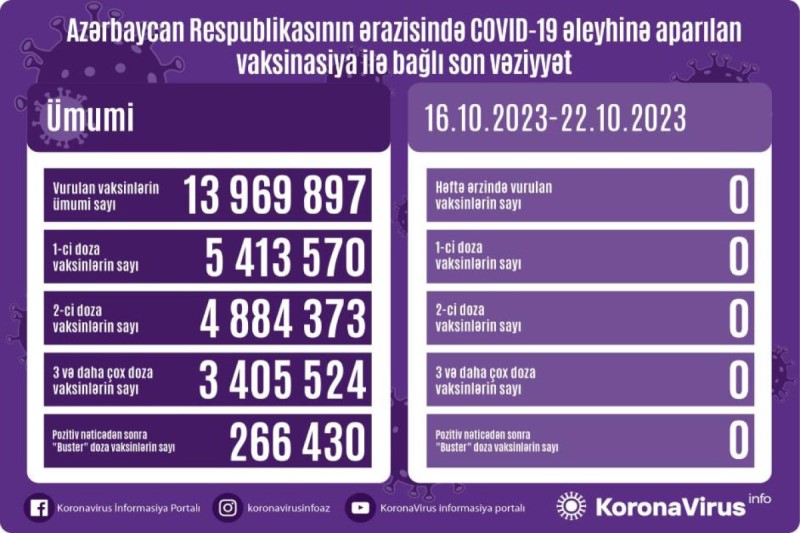 Ölkədə vurulan vaksinlərin ümumi sayı 13 969 897, birinci mərhələ üzrə vaksinasiya olunanların ümumi sayı 5 413 570, ikinci mərhələ üzrə vaksinasiya olunanların sayı 4 884 373, üç və daha çox doza vaksin vurduranların sayı 3 405 524, pozitiv nəticədən sonra buster doza üzrə vaksinasiya olunanların sayı isə 266 430 təşkil edir.
