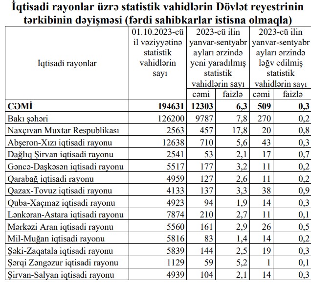 01.10.2023-cü il vəziyyətinə statistik vahidlərin sayı (fərdi sahibkarlar istisna olmaqla) 194 min 631 olub.