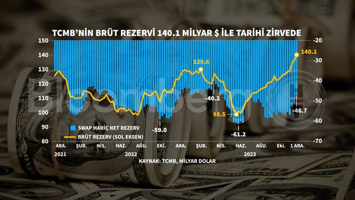 TCMB-nin məlumatlarına görə, 1 dekabr həftəsi etibarilə ümumi ehtiyatlar 140,1 milyard dollara çataraq tarixi ən yüksək səviyyəyə yüksəlib.