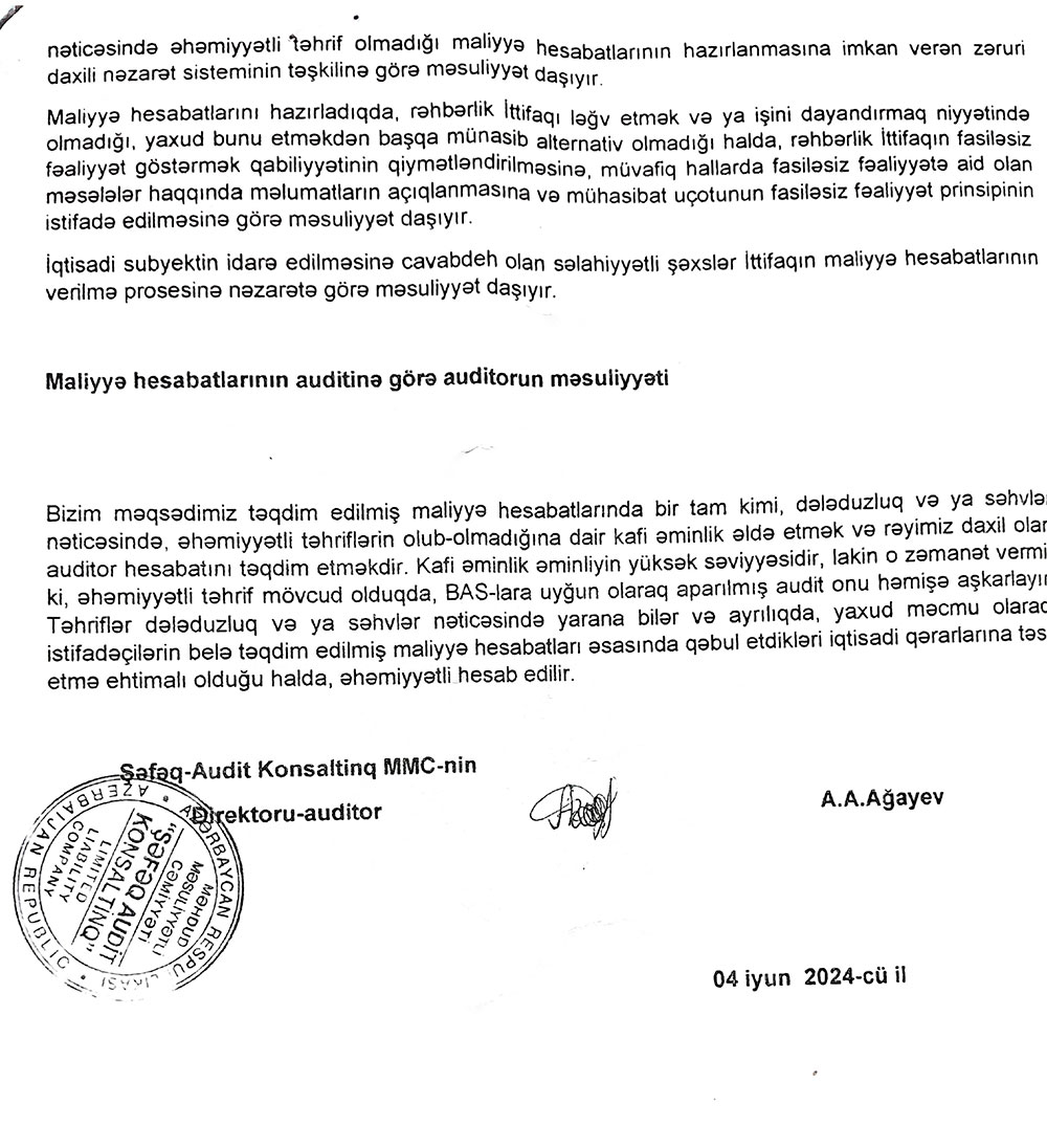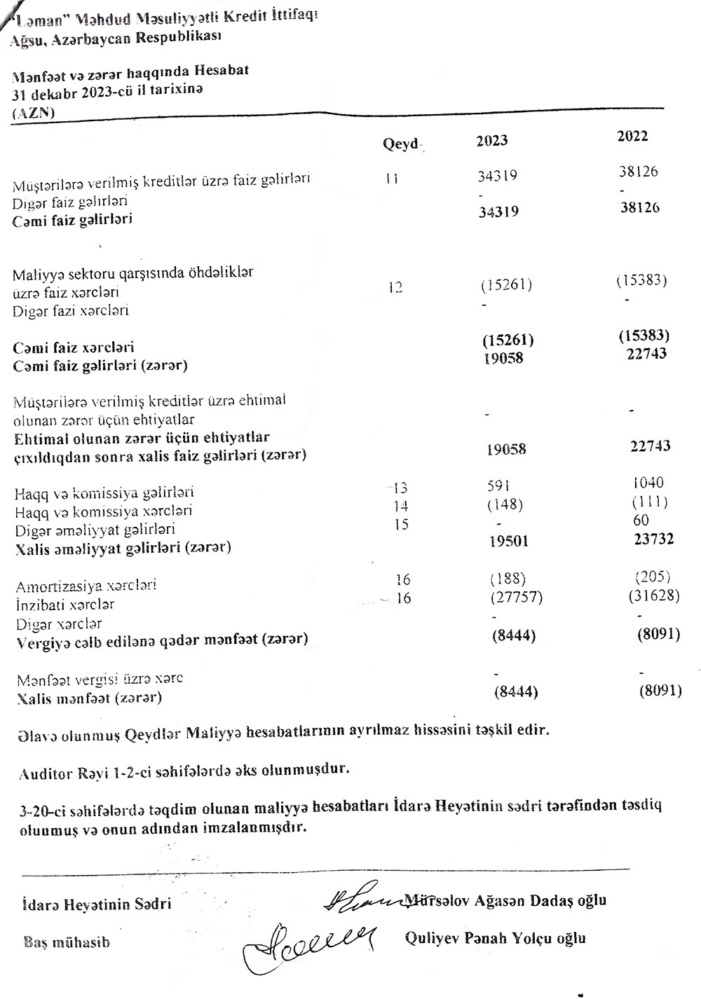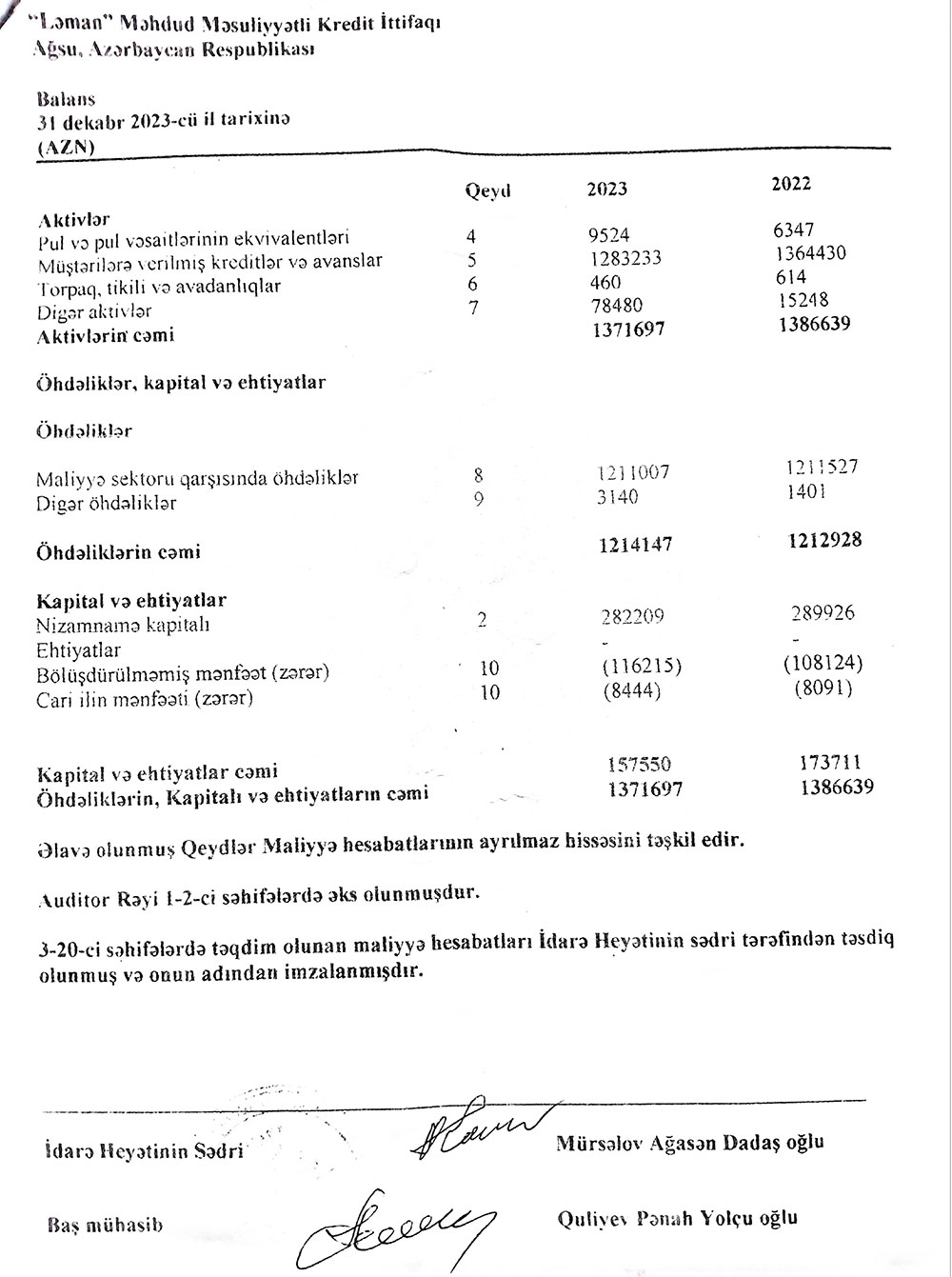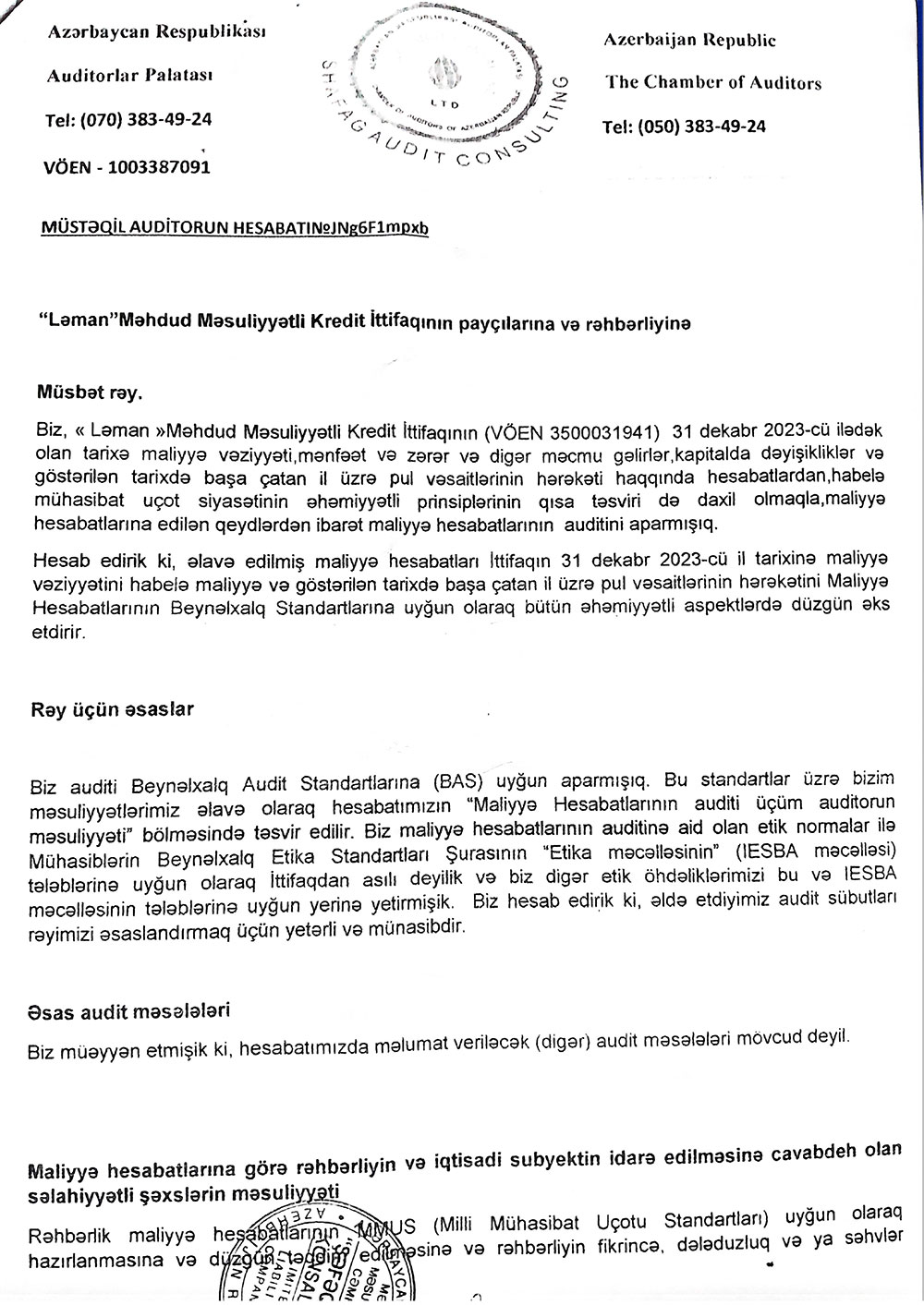 "Ləman" Məhdud Məsuliyyətli Kredit İttifaqının 31 dekabr 2023-cü il tarixində başa çatmış il üzrə maliyyə hesabatları.