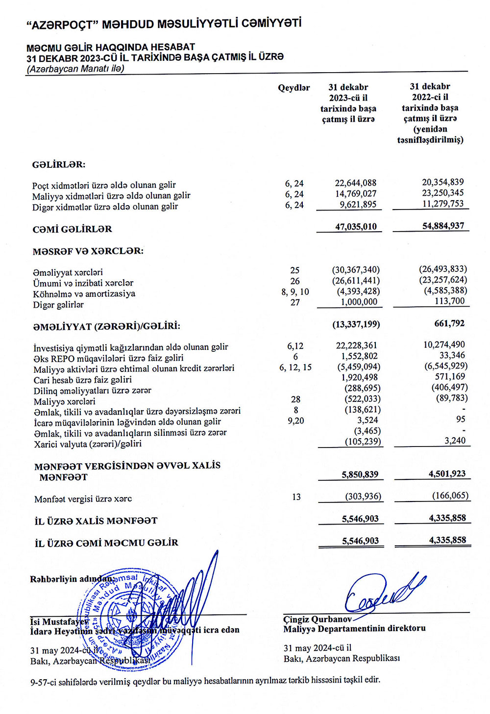 "Azərpoçt"un maliyyə xidmətləri üzrə gəlirləri azalıb."Azərpoçt" MMC 2023-cü ili 5 milyon 547 min manat xalis mənfəət ilə başa vurub. Dövlət şirkəti 2022-ci ili 4 milyon 336 min manat xalis mənfəət ilə bağlamışdı. Beləliklə, ötən il "Azərpoçt" MMC-nin xalis mənfəəti 1 milyon 211 min manat və ya 27,9% artıb. Xalis mənfəətin artması investisiya qiymətli kağızlarından və əks-repo ənəliyyatlarından əldə edilən gəlirin artması ilə əlaqədardır.