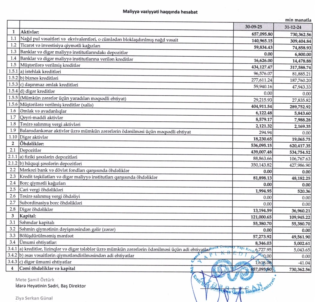 30 sentyabr 2025-ci il tarixinə “Yapı Kredi Bank Azərbaycan”ın cəmi aktivləri 657 milyon 96 min manat təşkil edib. Bu, 31 dekabr 2024-cü ilə nisbətən 73 milyon 266 min manat və ya 10% azdır. Aktivlərin azalmasına bankın depozit və öhdəliklər portfelindəki azalma təsir göstərib.