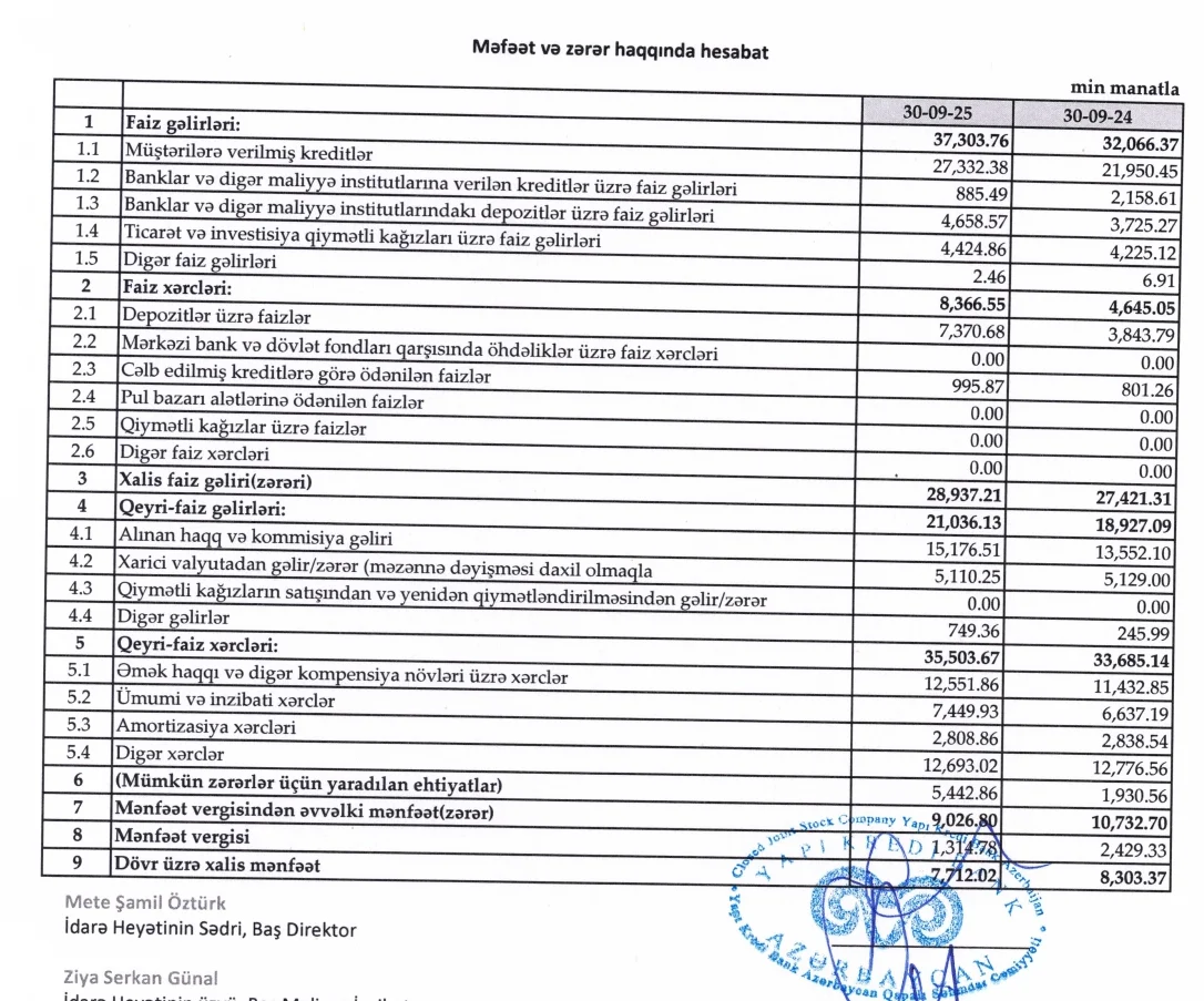 “Yapı Kredi Bank Azərbaycan” QSC 2025-ci ilin 9 ayını 7 milyon 712 min manat xalis mənfəət ilə başa vurub. Bu, ötən ilin eyni dövrünə nisbətən 591 min manat və ya 7,1% azdır (2024-cü ilin eyni dövründə 8 milyon 303 min manat). Xalis mənfəətin azalması mümkün zərərlər üçün yaradılan ehtiyatlara əməliyyat mənfəətindən ayrılan vəsaitin 2,8 dəfə artaraq 1 milyon 931 min manatdan 5 milyon 443 min manata yüksəlməsilə əlaqədardır. Mərkəzi Bankın yenilənmiş tələbləri bankları daha ehtiyatlı olmağa vadar edir. Ehtiyatların yaradılması bankın gələcəkdə daha dayanıqlı fəaliyyəti göstərməsi üçün vacibdir.