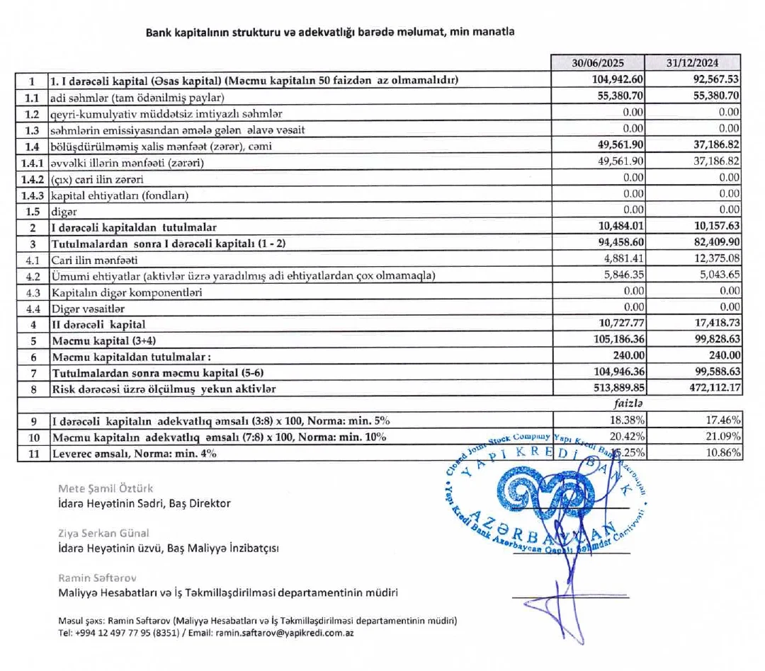 “Yapı Kredi Bank Azərbaycan”ın məcmu kapitalı ötən ilin sonundakı 99 milyon 588 min manatdan 104 milyon 946 min manata yüksəlib. Artım 5 milyon 358 min manat və ya 5,4% təşkil edib. Bu, bankın maliyyə dayanıqlılığının qorunduğunu göstərir.