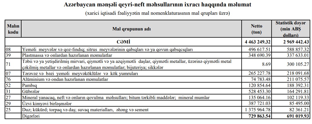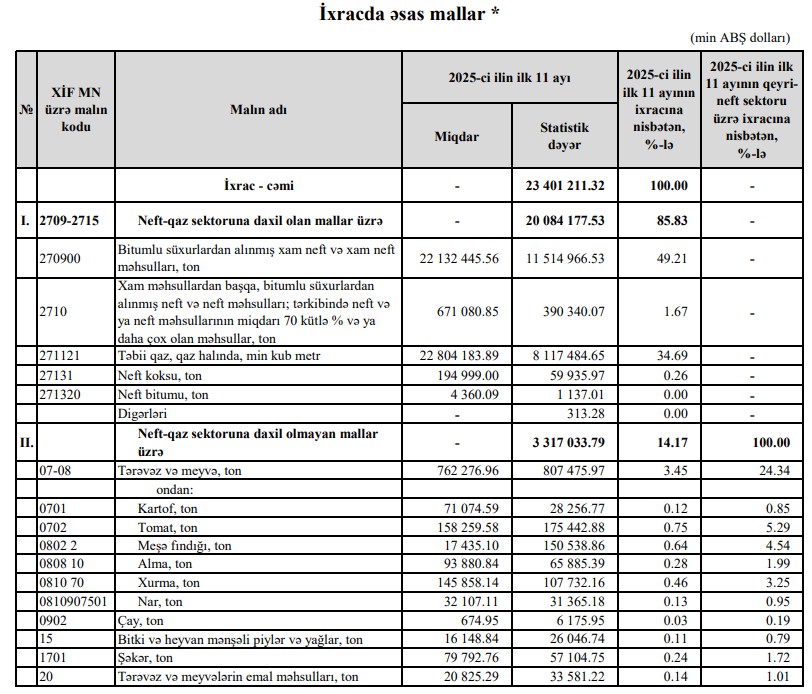 2025-cü ilin yanvar-noyabr aylarında (11 ayda) Azərbaycanın ən çox ixrac və idxal etdiyi mallar.