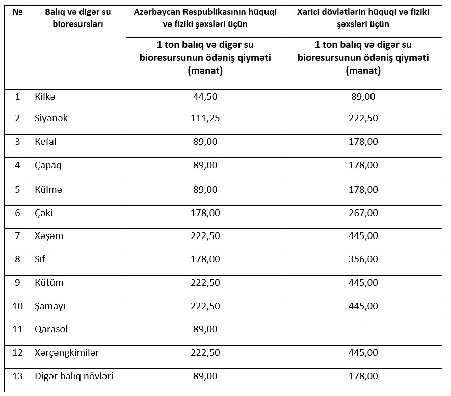 2026-cı ildə balıq və digər su bioresurslarının sənaye, əmtəə məqsədilə akvakultura, təhsil və maarifləndirmə məqsədilə ovuna görə Azərbaycan Respublikasının və xarici dövlətlərin hüquqi və fiziki şəxsləri üçün müəyyən edilmiş ödəniş qiymətləri