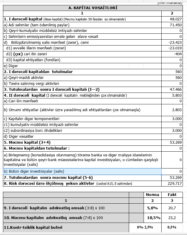 Bankın məcmu kapitalı 2025-ci ilin sonunda 53 milyon 269 min manat olub. Bu, 2024-cü ilin sonu ilə müqayisədə 2 milyon 182 min manat və ya 4,3 faiz artım deməkdir.