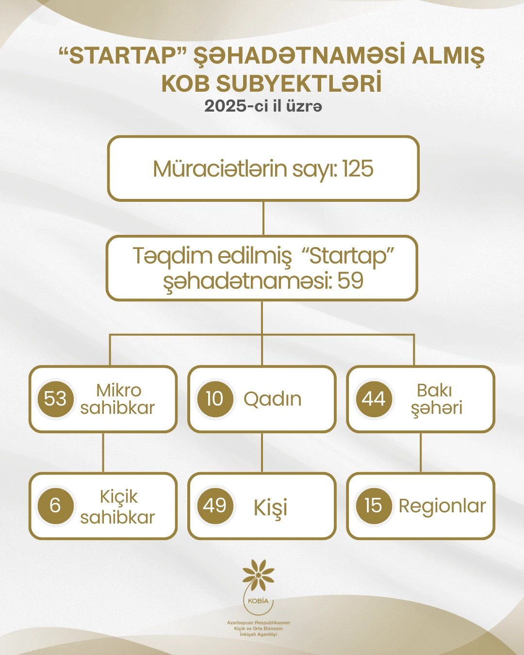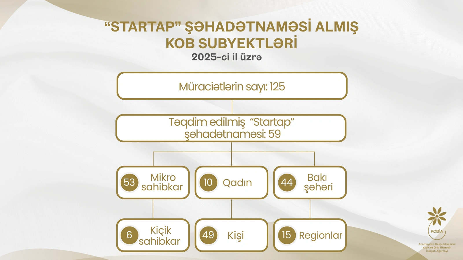 “Startap” şəhadətnaməsi verilmiş layihələr maliyyə, təhsil və səhiyyə texnologiyaları, e-ticarət və rəqəmsal marketinq, rəqəmsal ödəniş sistemləri və s. sahələri əhatə edir.2025-ci ildə 125 mikro və kiçik sahibkarlıq subyekti “Startap” şəhadətnaməsi almaq üçün Kiçik və Orta Biznesin İnkişafı Agentliyinə (KOBİA) müraciət edib.