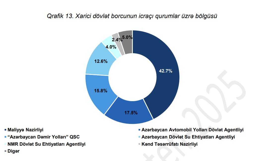 Maliyyə Nazirliyi, Azərbaycan Avtomobil Yolları Dövlət Agentliyi,  “Azərbaycan Dəmir Yolları” QSC, Azərbaycan Dövlət Su Ehtiyatları Agentliyi, Naxçıvan Dövlət Su Ehtiyatları Agentliyi və Kənd Təsərrüfatı Nazirliyi ən çox xarici borcu olan dövlət qurumlarıdır.