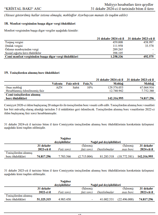 31 dekabr 2024-cü il tarixində "Kristal Bakı" ASC-nin təsisçilərindən alınmış borc öhdəlikləri 142 milyon 317 min manat təşkil edib. Bu məbləğ 2023-cü ilin sonunda 74 milyon 817 min manat idi.