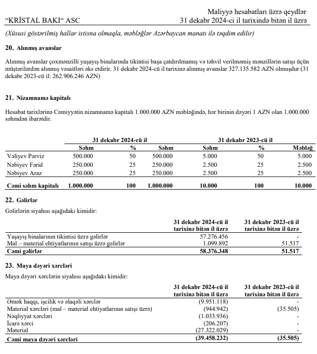 31 dekabr 2024-cü il tarixinə "Kristal Bakı" ASC-nin müştərilərdən alıdığı avansların cəmi məbləği 327 milyon 136 min manat təşkil edib (31 dekabr 2023-cü il tarixində 262 milyon 906 min manat olmuşdu).
