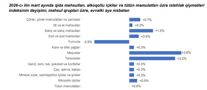 2026-cı ilin mart ayında əvvəlki aya nisbətən ayrı-ayrı qida məhsullarından əsasən uzun düyü, çörək, toyuq əti, təzə balıq, süd, pendir, süfrə marqarini, günəbaxan və qarğıdalı yağları, limon, portağal, naringi, banan, alma, armud, kivi, qoz, fındıq, xiyar, pomidor, şirin bibər, balqabaq, yerkökü, kartof bahalaşmış, yumurta, şabalıd, gül kələmi, brokkoli, sarımsaq, soğan isə ucuzlaşmışdır. Digər qida məhsullarının qiymətlərində ciddi dəyişikliklər baş verməmişdir.
