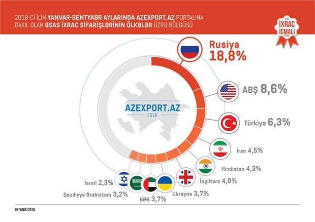 “İxrac İcmalı”nda 2018-ci ilin yanvar-sentyabr ayları ərzində Azexport.az portalına daxil olan ixrac sifarişləri barədə də məlumat verilib. Göstərilib ki, 2018-ci ilin sentyabr ayı ərzində Azexport.az portalına 43 milyon ABŞ dolları məbləğində ixrac sifarişləri daxil olub. Ümumilikdə isə 2018-ci ilin yanvar-sentyabr aylarında Azexport.az portalına daxil olan ixrac sifarişlərinin dəyəri 410 milyon ABŞ dolları təşkil edib. 2017-ci ilin müvafiq dövrü ilə müqayisədə 2018-ci ilin yanvar-sentyabr aylarında Azexport.az portalına daxil olan ixrac sifarişləri dəyər baxımından 15 faiz artıb.