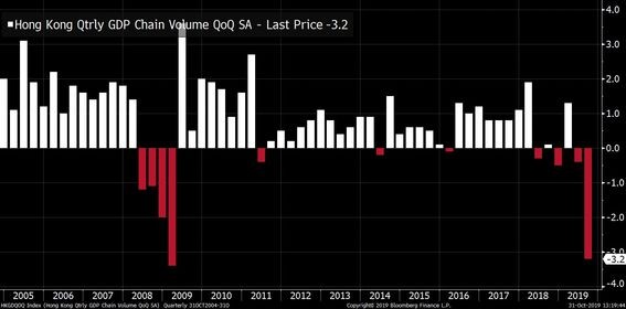 Honq Konq iqtisadiyyatı 2-ci rüb ilə müqayisədə 3-cü rübdə 3.2% azalaraq texniki durğunluğa girib. İqtisadçılar 0.6% geriləmə gözləyirdilər.