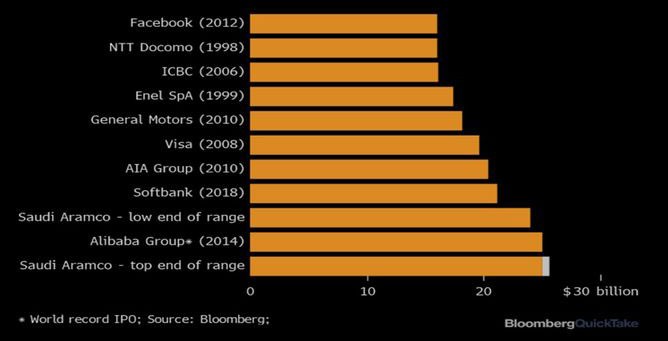 "Saudi Aramco"nun son səhm qiymətinin 5 dekabrda açıqlanması gözlənilir. Qiymətin 8,33 dolların üzərində olması vəziyyətində isə Çinin e-ticarət nəhəngi "Alibaba"nın 19 Sentyabr 2014-də Nyu-York birjasında keçirilmiş səhmlərinin ilkin kütləvi satışından əldə etdiyi 25 milyard dollarlıq gəlir rekordu qırılmış olacaq.