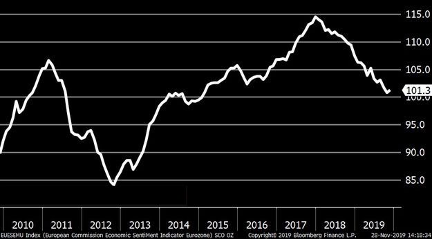 Avropa Komissiyası tərəfindən Brükseldə Cümə axşamı günü açıqlanan məlumatlara görə, Noyabr ayında Avro Bölgəsində iqtisadi güvən indeksi 101.3 səviyyəsinə yüksəlib.