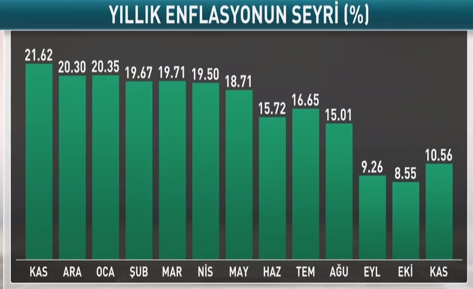 Türkiyədə istehlakçı qiymətləri indeksi (inflyasiya) Noyabrda illik müqayisədə 8.55%-dən 10.56%-ə yüksəlib, aylıq müqayisədə isə 0.38% artıb.