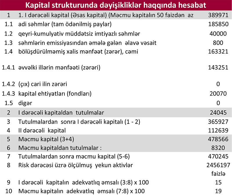 Həm cəmi gəlirlərinin artması ilə əməliyyat mənfəətinin artması, həm də məqsədli ehtiyatdan geri qayıdan vəsait hesabına ilk rübdə Kapital Bankın xalis mənfəəti daha yüksək olub. Məqsədli ehtiyatdan vəsaitin geri qayıtması Kapital Bankda problemli kreditlərin azaldığına işarədir.
