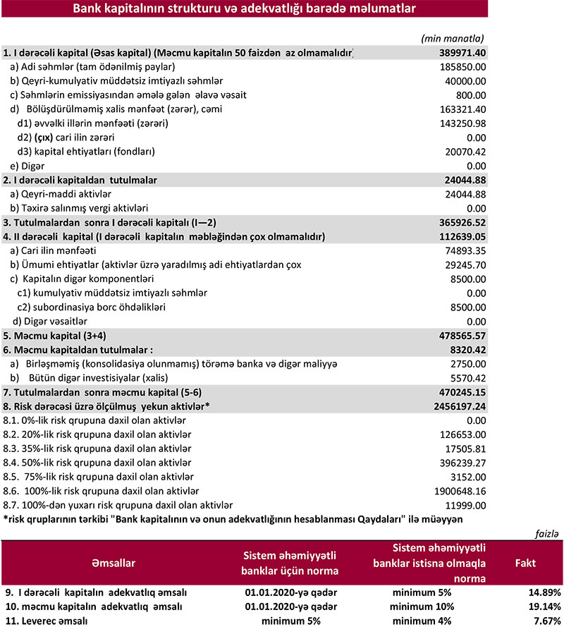31 Mart 2020-ci il tarixində Kapital Bank 470 milyon 245 min manat məcmu kapitala malik olub.