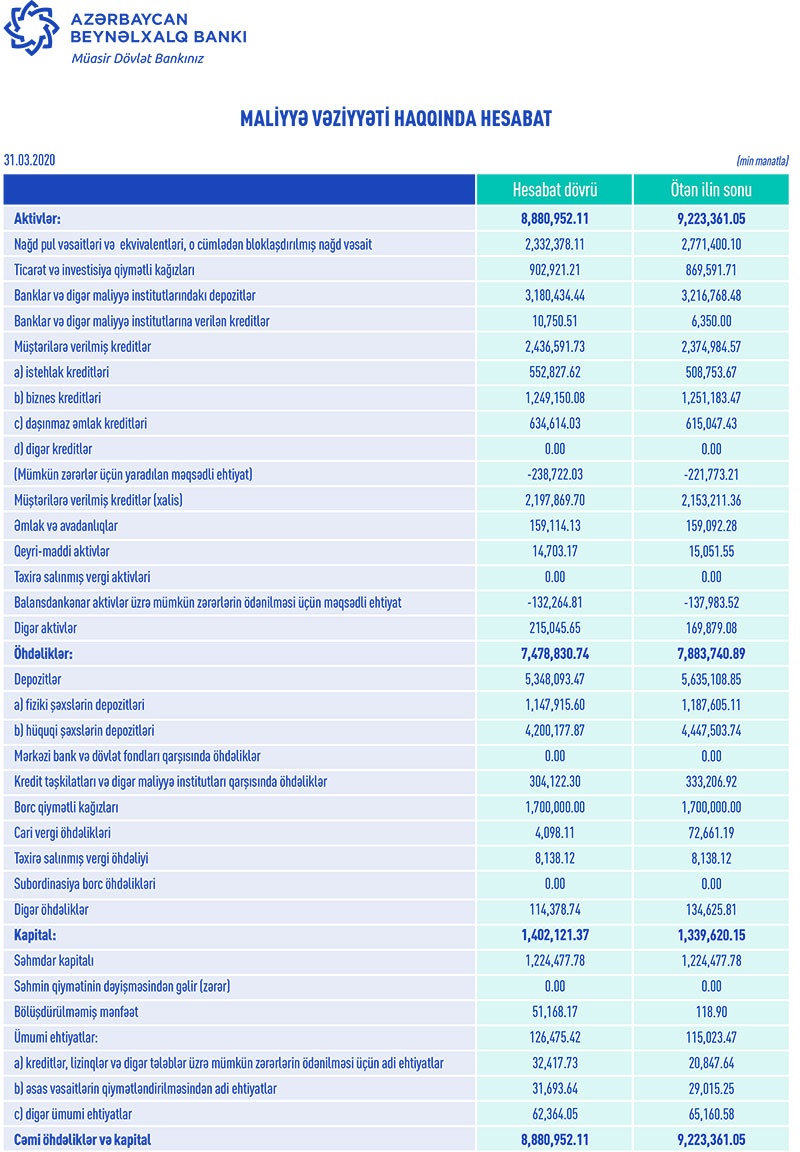 31 Mart 2020-ci il tarixində Azərbaycan Beynəlxalq Bankı 1 milyard 296 milyon 38 min manat məcmu kapitala malik olub.